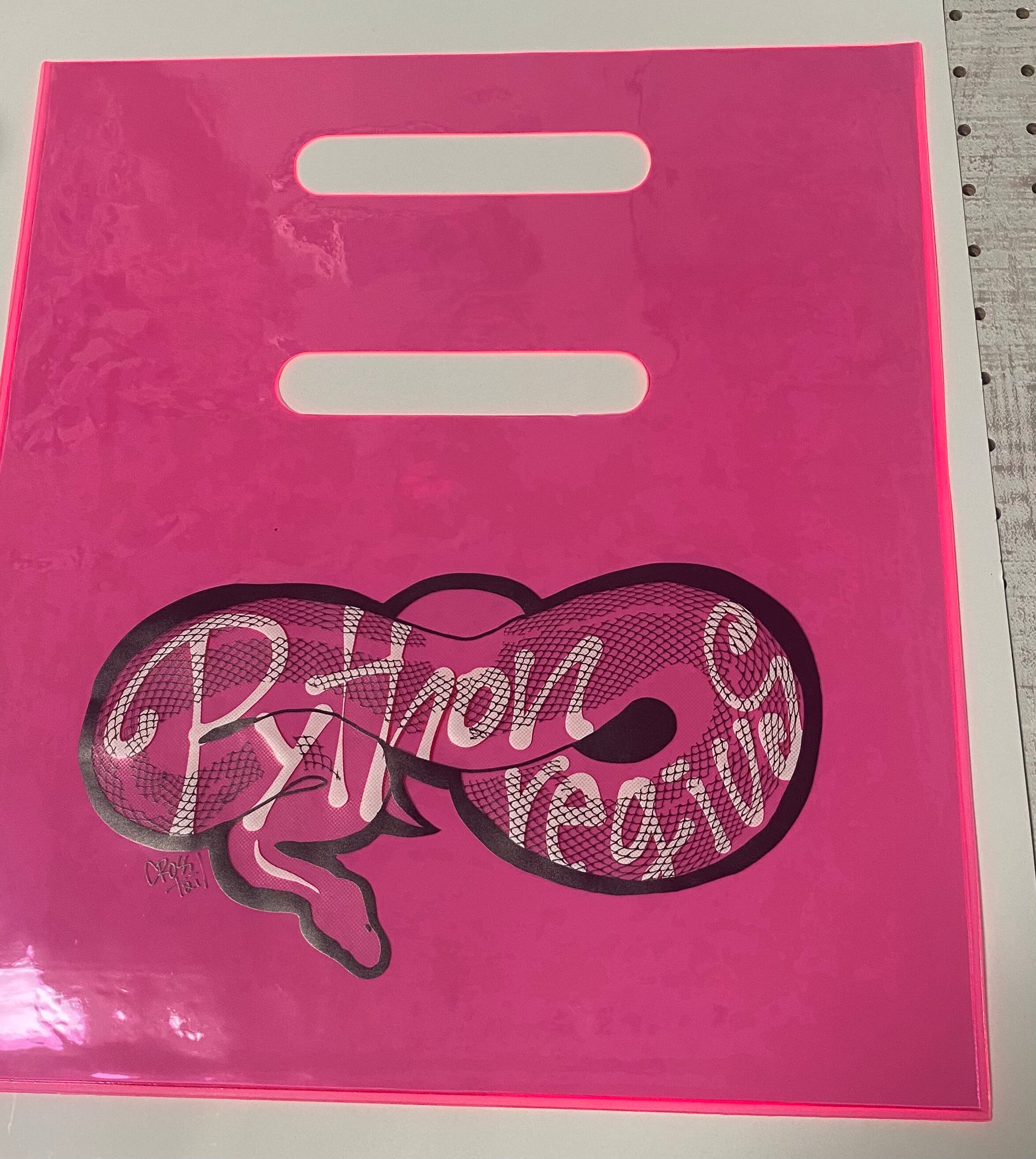飼育しているボールパイソンをモデルに、イラストをプリントした、夏らしいビニールバッグです!